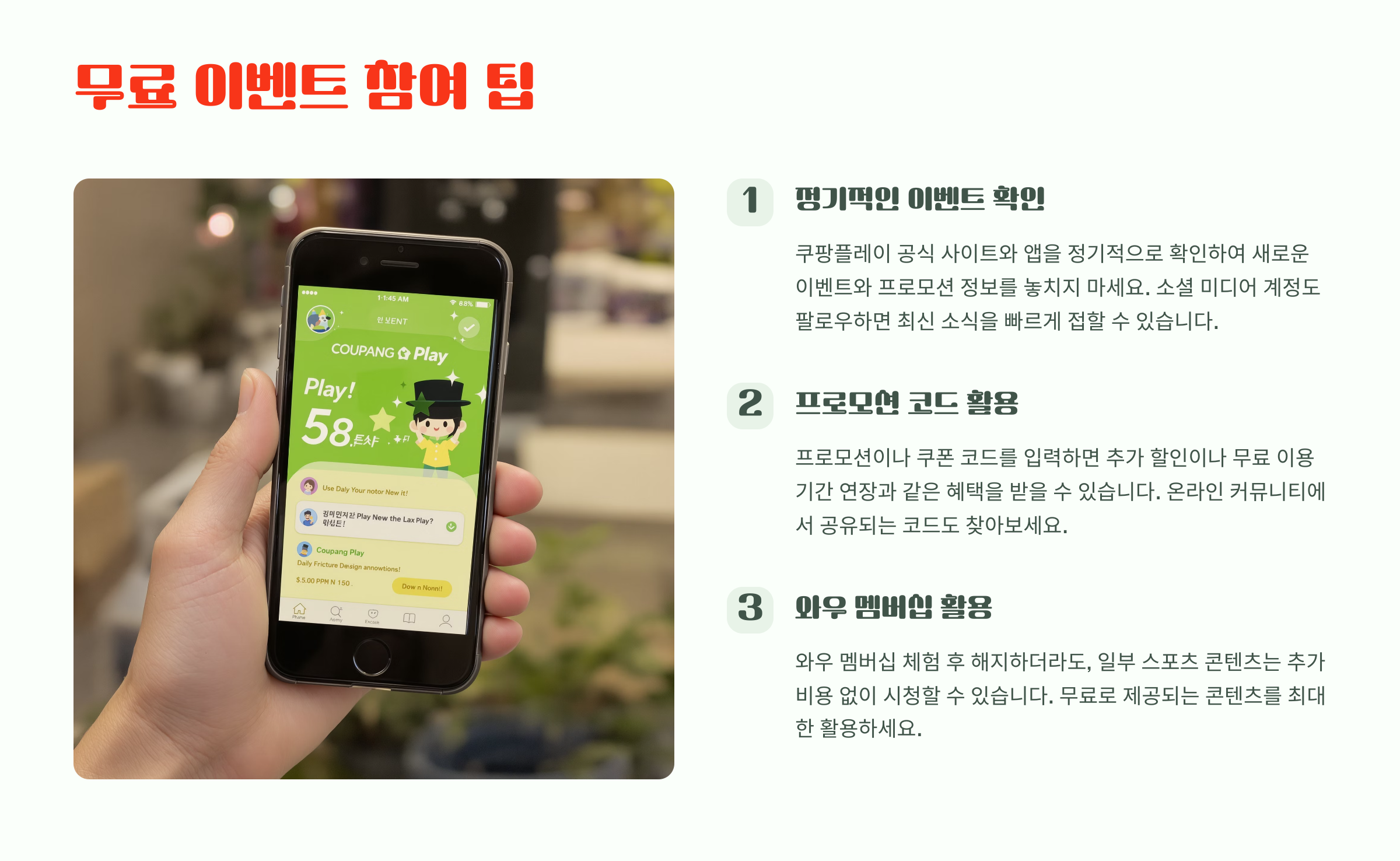 정기적으로 열리는 이벤트는 쿠팡 앱 > 쿠팡플레이 배너 또는 메인홈에서 확인 가능해요. 이거 하나로 친구랑 같이 경기 보면 완전 꿀잼이에요. 🍿