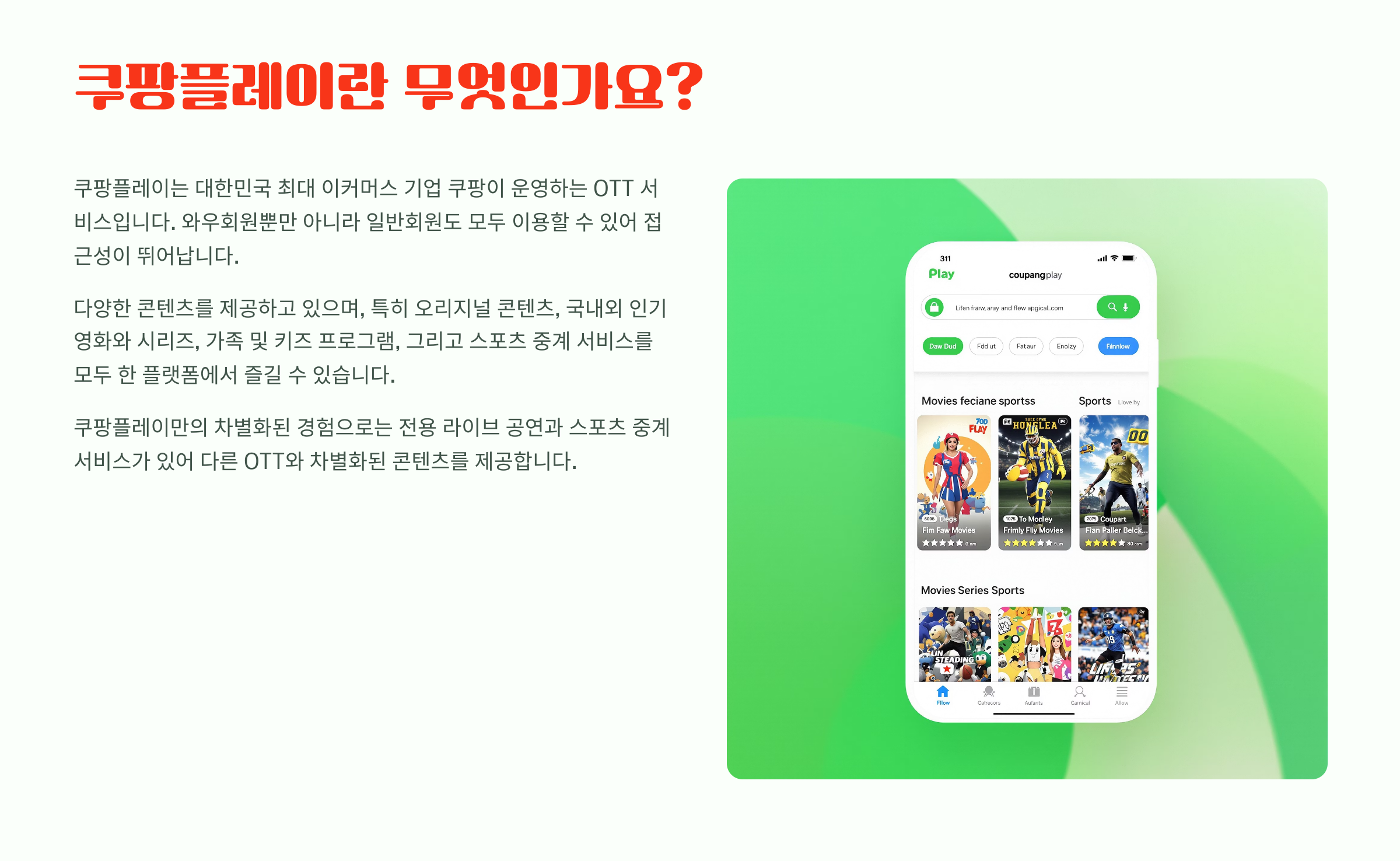 쿠팡플레이는 쿠팡에서 자체 운영하는 OTT(Over The Top) 플랫폼이에요. 📱