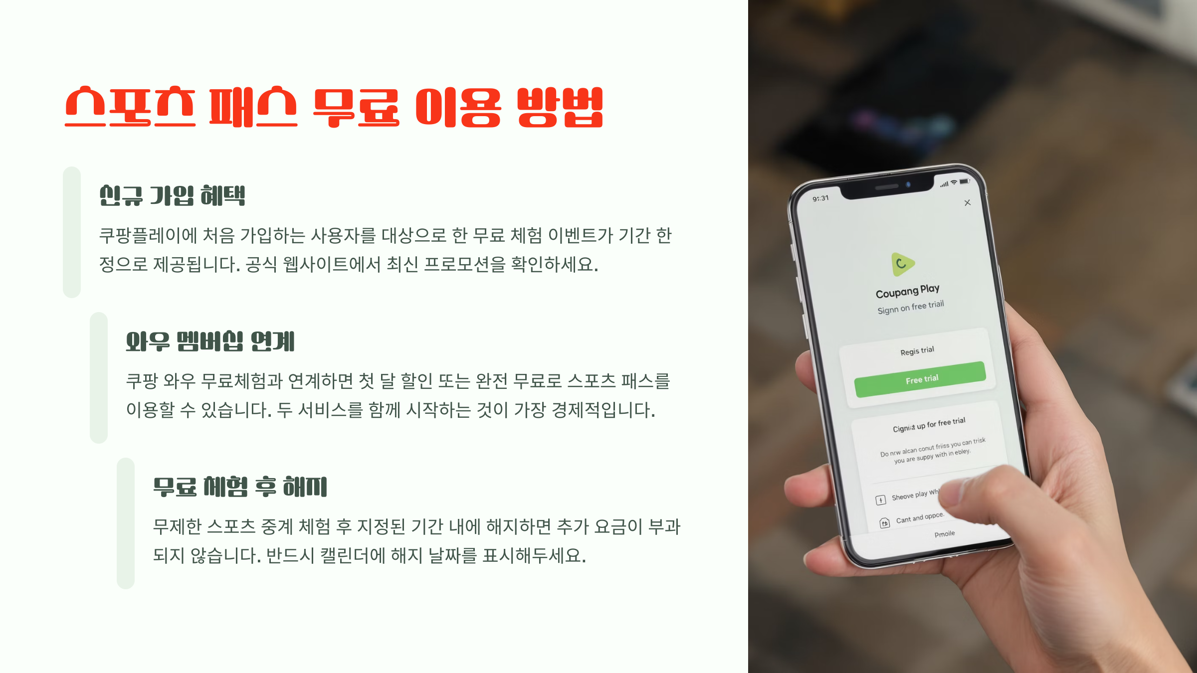 하지만 아직도 많은 분들이 "무료로 볼 수 있어요?"라는 질문을 자주 하시더라고요. 그래서 오늘은 쿠팡플레이 스포츠 패스를 무료로 보는 꿀팁을 속 시원하게 정리해봤어요. 🤩