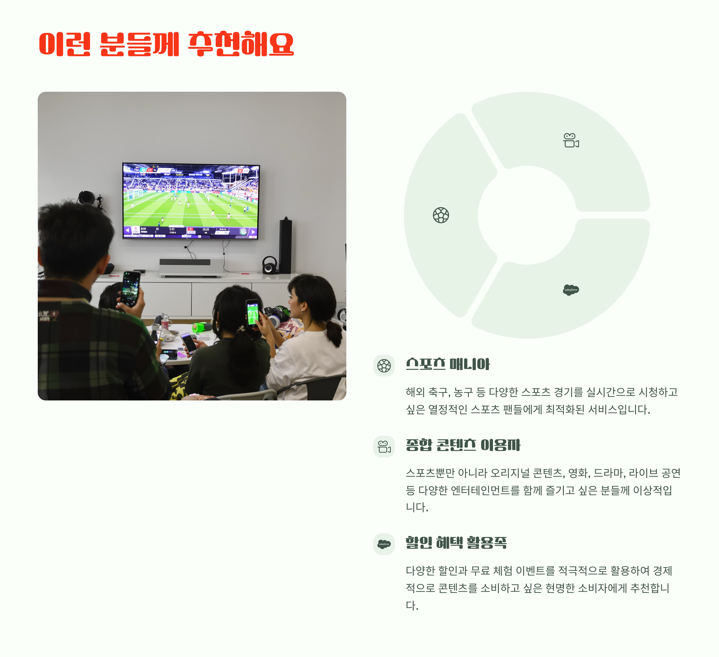 넷플릭스나 디즈니+, 웨이브처럼 영화, 드라마, 예능 등을 스트리밍으로 볼 수 있는 서비스죠. 그런데 차별점이 하나 있어요. 바로 '스포츠 중계'예요! ⚽️