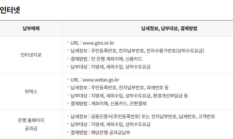 납부는 전국 은행, ATM기기, 인터넷 위택스(Wetax), 스마트폰 앱(ETAX, 지방세모바일 등)을 통해 간편하게 할 수 있어요. 전자납부번호나 QR코드를 활용해도 되고요.