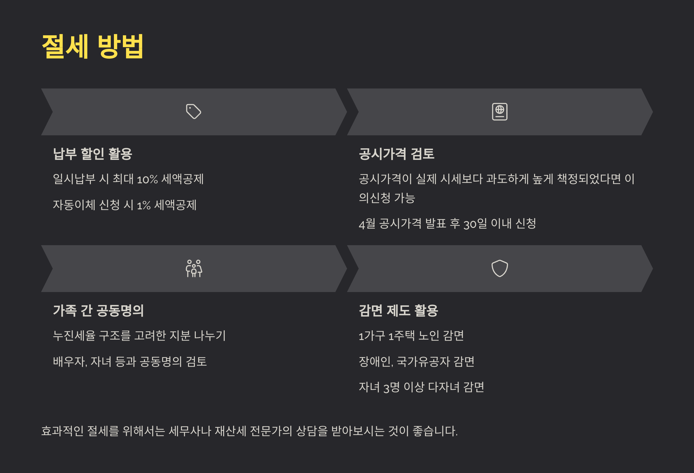 절세는 크게 3가지 방법으로 나뉘어요. 첫째, 공시가격 조정 신청. 둘째, 면제·감면 제도 활용. 셋째, 소유구조 분산 전략이에요.
