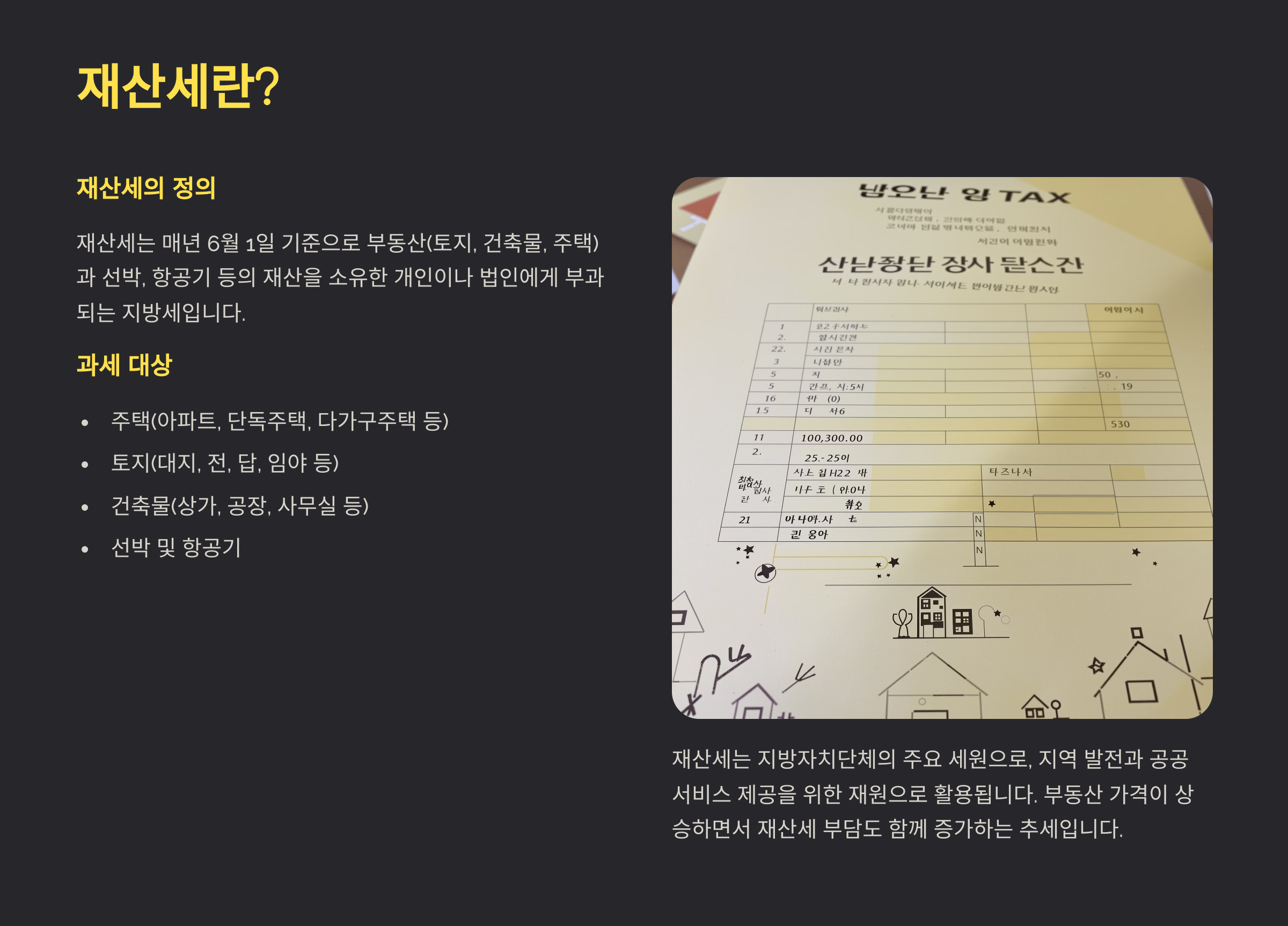 재산세는 부동산 등 재산을 소유한 사람에게 부과되는 지방세예요. 주택, 건물, 토지, 선박, 항공기 등 다양한 유형의 재산에 적용되고, 각 지방자치단체의 세입으로 활용된답니다.