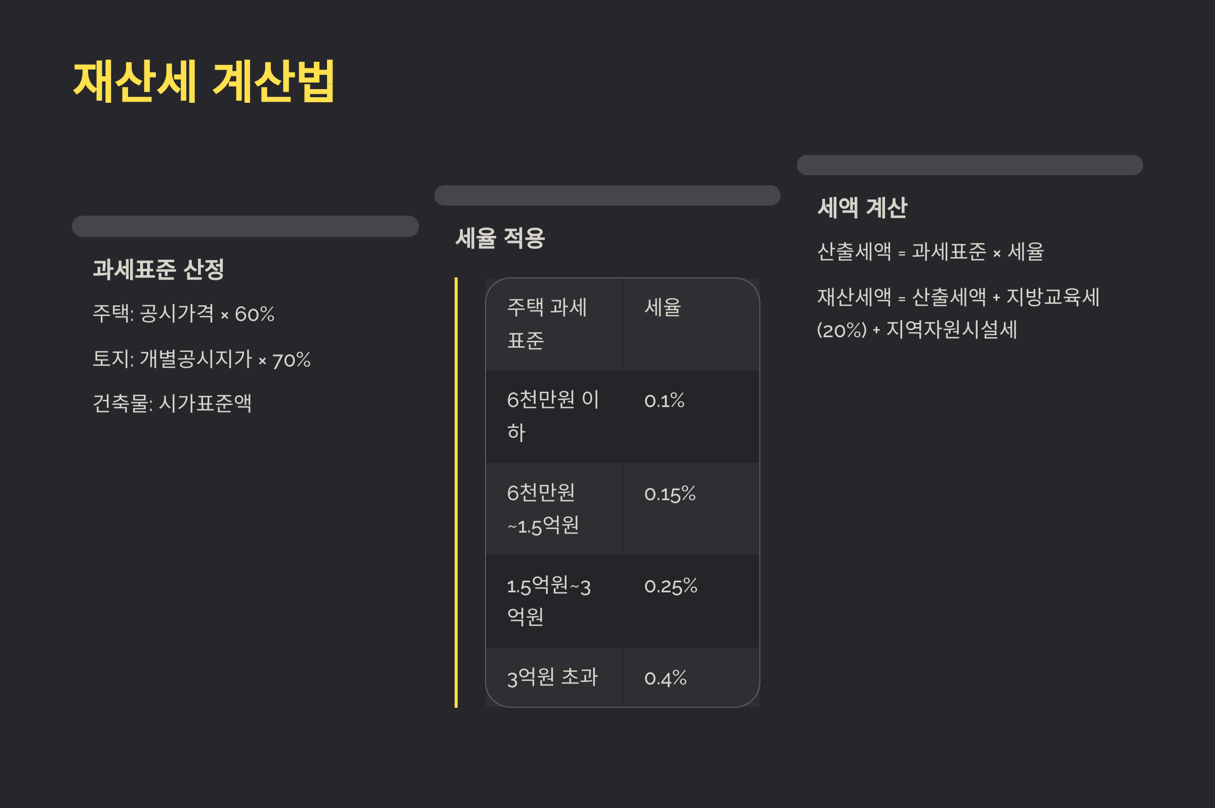 재산세는 생각보다 복잡하게 느껴질 수 있지만, 원리를 알면 훨씬 간단하게 다가올 수 있어요. 재산세 계산은 다음의 4단계 공식을 기준으로 진행돼요: