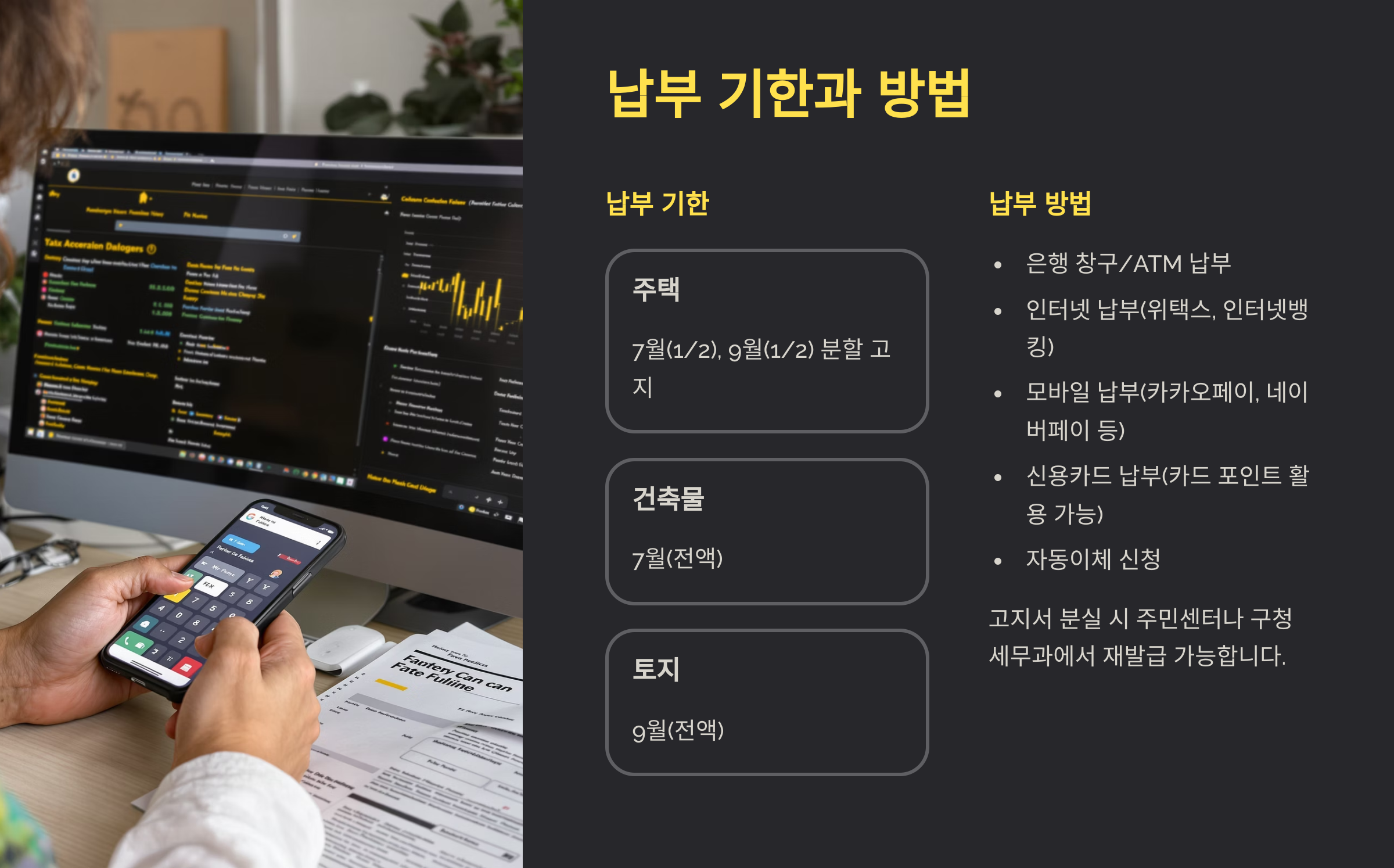 재산세는 매년 2회에 걸쳐 부과되며, 1기분은 7월, 2기분은 9월에 납부해요. 부과 기준일인 6월 1일 기준으로 소유자가 고지서를 받게 되고, 고지서가 도착한 다음 달부터 납부 기간이에요.